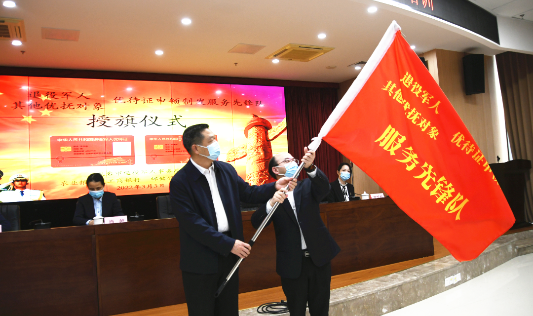 3月3日上午,龙岩市成立优待证申领制发服务先锋队,并举行服务先锋队授旗仪式,这在我省尚属首个。授旗仪式上,龙岩市退役军人事务局副局长张锦伟向农业银行龙岩分行、工商银行龙岩分行、邮储银行龙岩分行、光大银行龙岩分行代表分别授予“优待证申领制发服务先锋队”队旗。