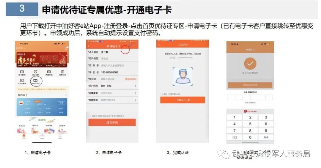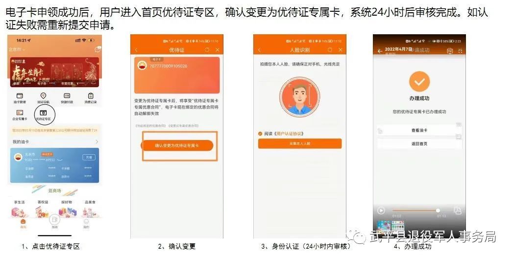 凭优待证本人在中油好客e站APP优待证专区申请办理后,由退役军人事务部审核通过后方可生效,生效后可在全国任意一家中石油进行加油消费享受9.7折或9.4折优惠;用户可到中国石油武平区域加油站进行办理。