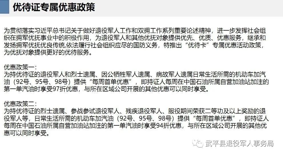 武平县医院、中国石油、梁野山景区、武平厦旅酒店、武平中影世纪东方影城以及县农业银行、邮储银行、工商银行等一大批企事业单位在武平县率先制定了“优待证”具体优待政策。具体如下: