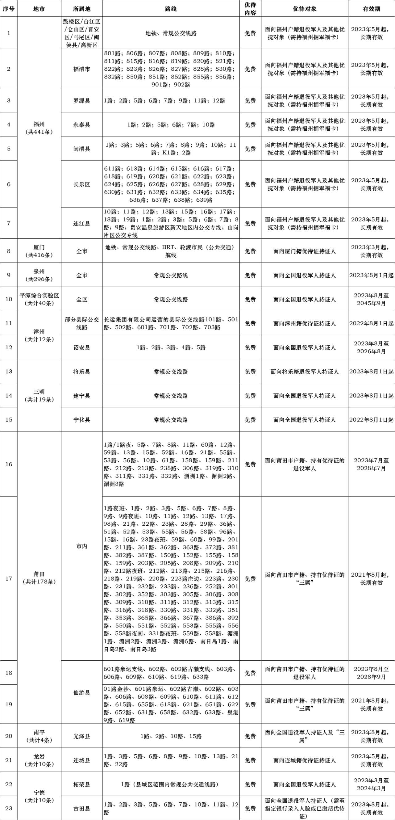 退役军人和其他优抚对象免费乘坐公共交通线路清单