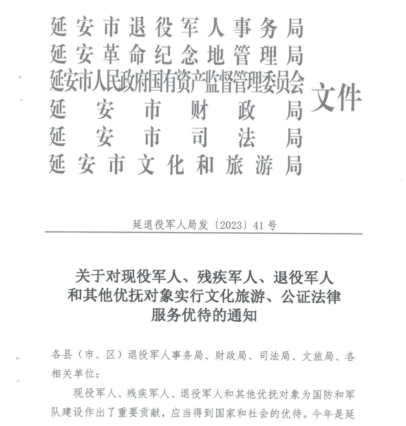 延安市退役军人事务局与市司法局、市文旅局等单位,联合印发《关于对现役军人、残疾军人、退役军人和其他优抚对象实行文化旅游、公证法律服务优待的通知》(简称《通知》),明确从9月1日起,现役军人、残疾军人、退役军人和其他优抚对象可享受文化旅游和公证法律服务优待。