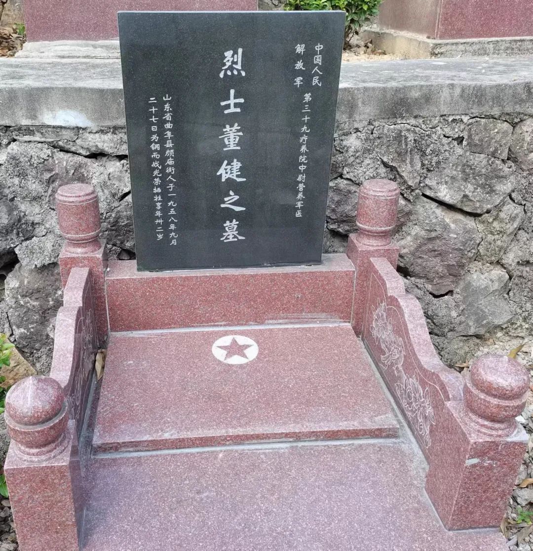 山东省曲埠县颜庙街人,中国人民解放军第三十九疗养院中尉营养军医,1958年9月27日为钢而战光荣牺牲,享年32岁。安葬位置:由武夷山玉女峰脚下集中迁葬至福建省南平市武夷山市妙安陵园烈士集中安葬区(中华英烈网查到2人,分别为:1.董健,性别:男,出生日期:1927年3月,籍贯:安徽省,政治面貌:群众,生前职务:医生,牺牲日期:1946年10月,牺牲地点:贵州德江,烈士事迹:董健,男,籍贯安徽省宿州市泗县墩集朱庙,1927年3月出生,1943年9月参加革命,1946年10月于贵州德江战斗牺牲。2.董健,性别:男,出生日期:1928年,籍贯:安徽省,政治面貌:中国共产党党员,生前职务:2支队卫生员,牺牲日期:1948年12月,牺牲地点:袁圩,安葬地点:永城市淮海战役陈官庄烈士陵园,烈士事迹:董健烈士,男,籍贯安徽省泗县,1928年出生,中共党员,所属部队华野一纵,职务2支队卫生员,1948年12月牺牲于袁圩,享年20岁)。