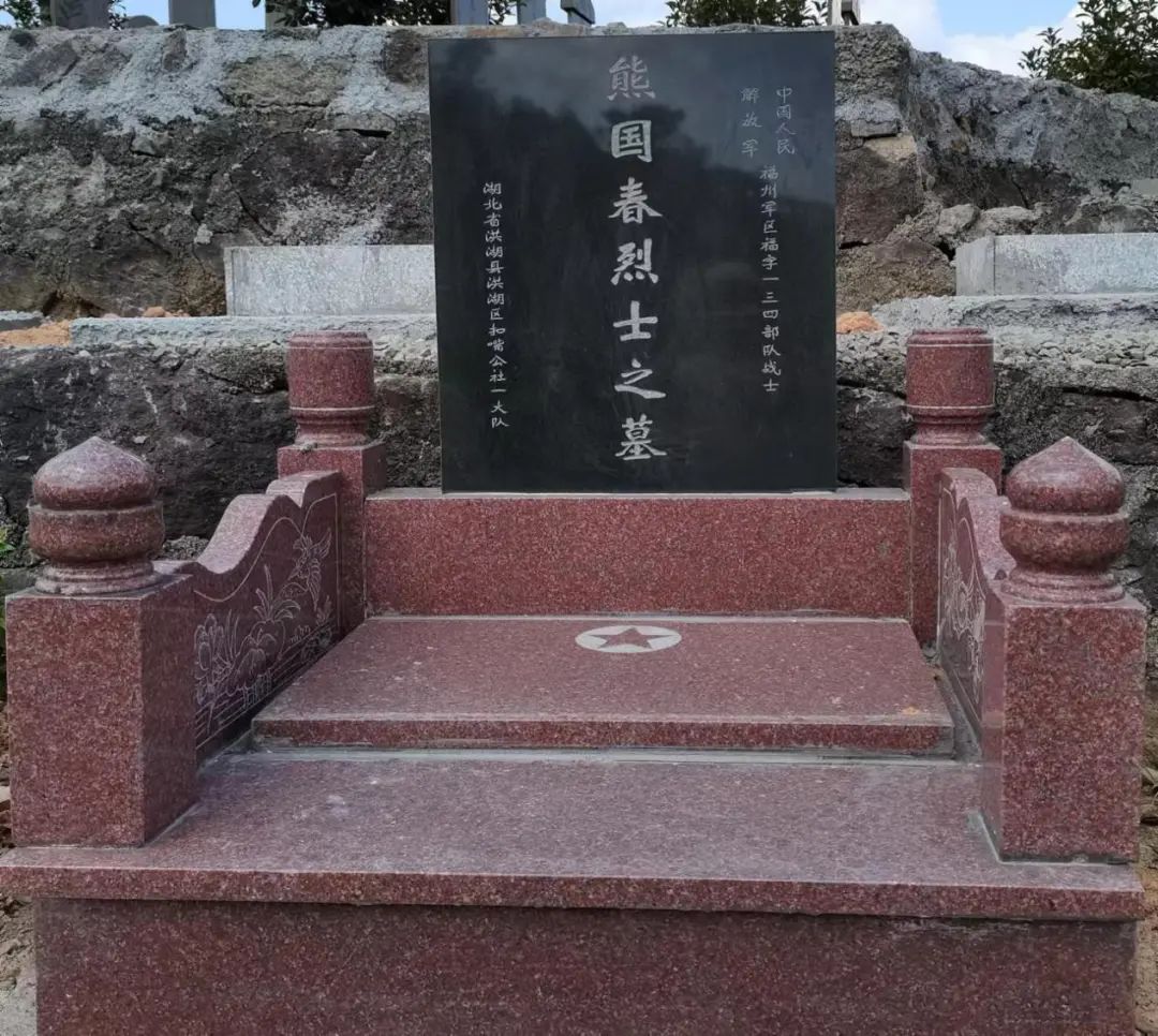 湖北省洪湖县洪湖区扣嘴公社一大队人,中国人民解放军福州军区福字一三四部队战士,安葬位置:由武夷山玉女峰脚下集中迁葬至福建省南平市武夷山市妙安陵园烈士集中安葬区(中华英烈网查到1人,熊国春,姓名:男,出生日期:1949年,籍贯:湖北省,生前职务:解放军福州军区通信战士,牺牲日期:1970年,牺牲地点:福建省福州市。烈士事迹:一九六八年参加革命。解放福州军区通信战士,多次立功受奖,曾出席军先代大会。1970年肺部急性中毒,经抢救无效逝世。由福州军区政治部追认为烈士)。