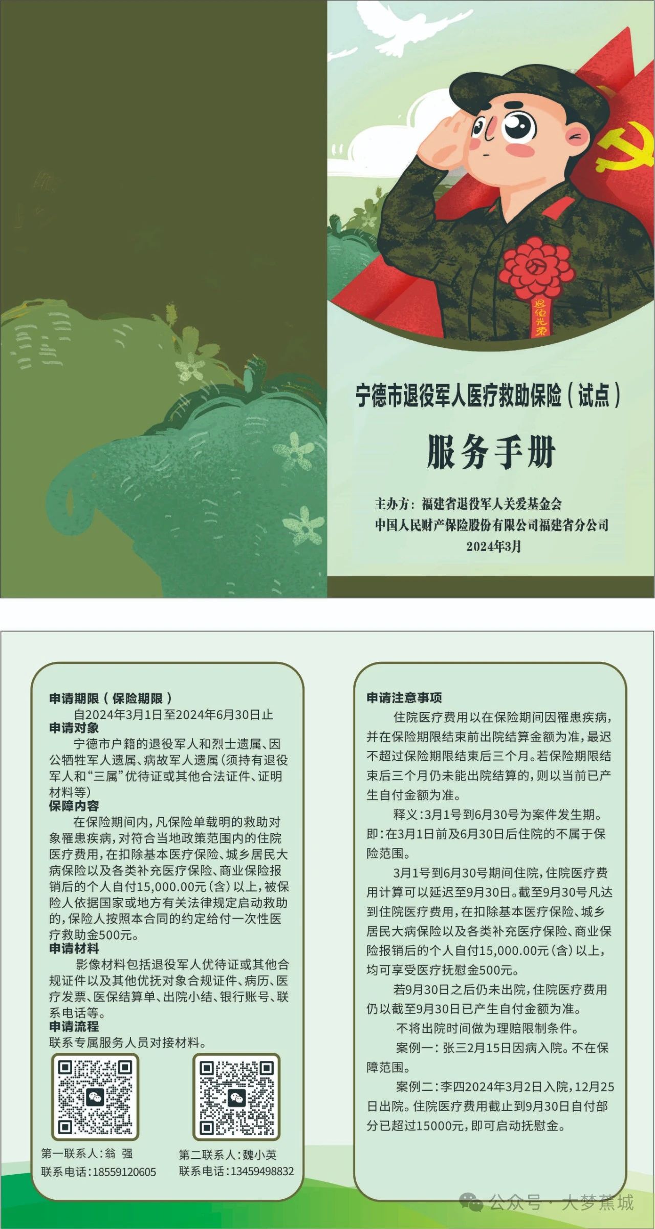 该项目试点从2024年3月1日至2024年6月30日止,宁德市户籍的退役军人和烈士遗属、因公牺牲军人遗属、病故军人遗属(须持有退役军人和“三属”优待证或其他合法证件、证明材料等),凡罹患疾病,对符合当地政策范围内的住院医疗费用,在扣除基本医疗保险、城乡居民大病保险以及各类补充医疗保险、商业保险报销后的个人自付15000元(含)以上,被保险人依据国家或地方有关法律规定启动救助的,按照约定给付一次性医疗救助金500元。