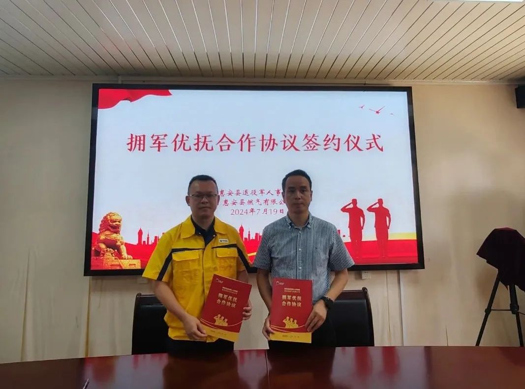 7月19日上午,惠安县退役军人事务局与惠安县燃气有限公司签订拥军优抚合作协议,全县享受国家定期抚恤补助的优抚对象享受居民用户管道燃气终端销售价优惠。