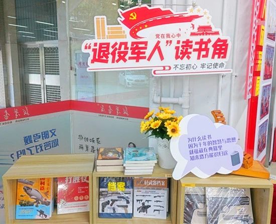 进入驿站内部,书香四溢、环境宜人。“退役军人”读书角拥军标识格外醒目。
