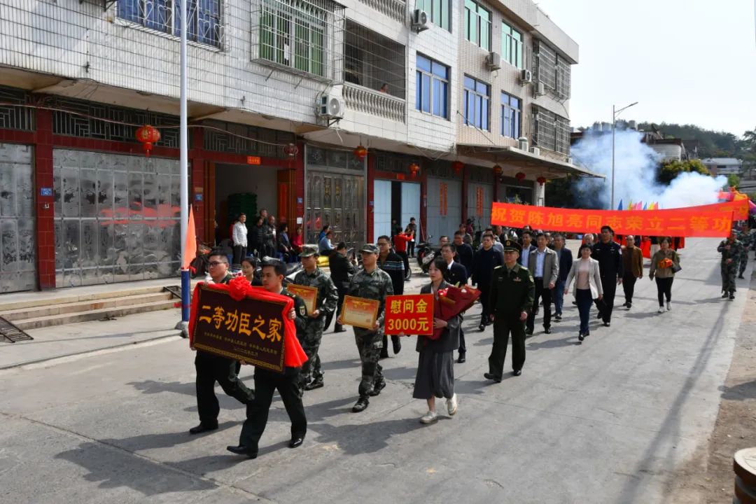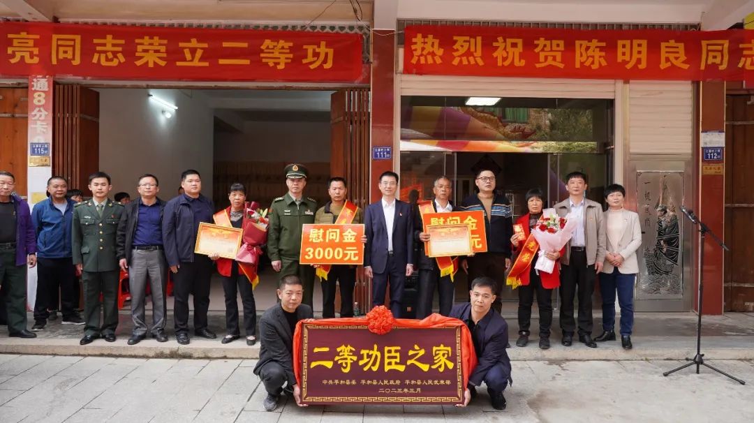 “咚咚锵,咚咚锵……”3月17日上午,漳州市平和县大溪镇江寨村锣鼓喧天、鞭炮齐鸣。陈明良和陈旭亮两兄弟家庭人头攒动、双喜临门,平和县县长黄永健带领军地领导一起为功臣家庭送喜报、送荣誉、送嘱托。