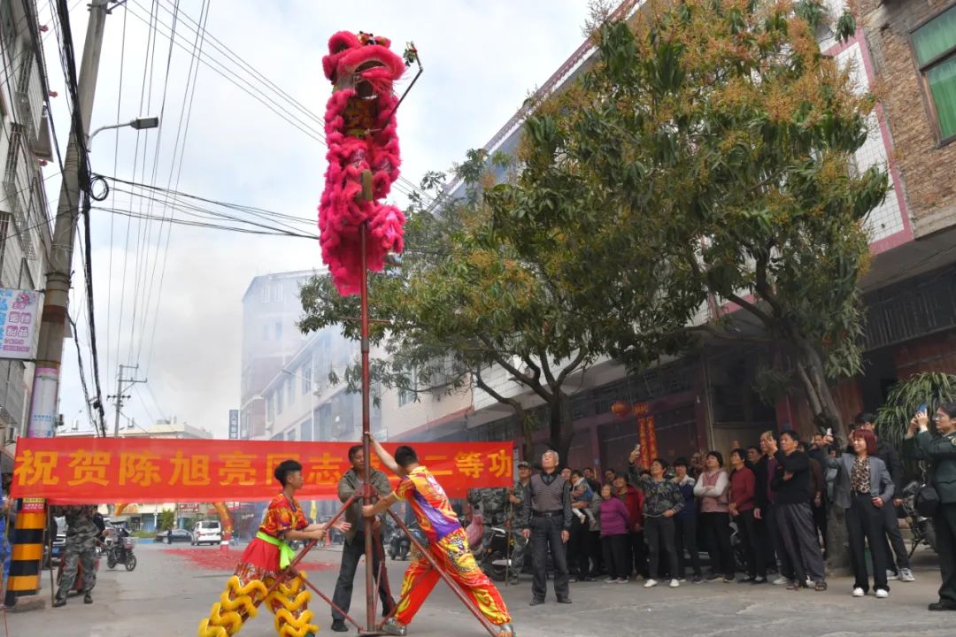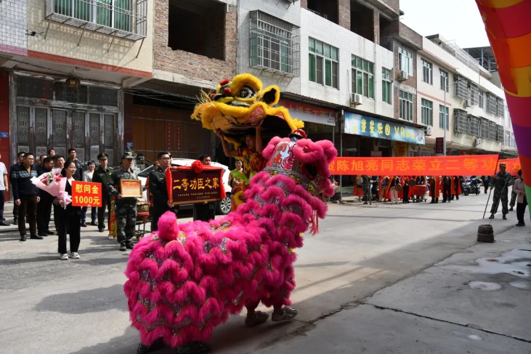 热热闹闹送喜报,军地联手贺功臣。上午10时许,“二等功臣之家”牌匾、三等功的喜报在民兵们的护送下,敲锣打鼓来到陈明良兄弟俩家中,一时间,围观的乡亲越来越多,“功臣”家里如同过年一样热闹。镇农民舞狮队敲锣打鼓现场表演,增添了活动氛围,提升了喜报喜气,真正使尊崇有温度。