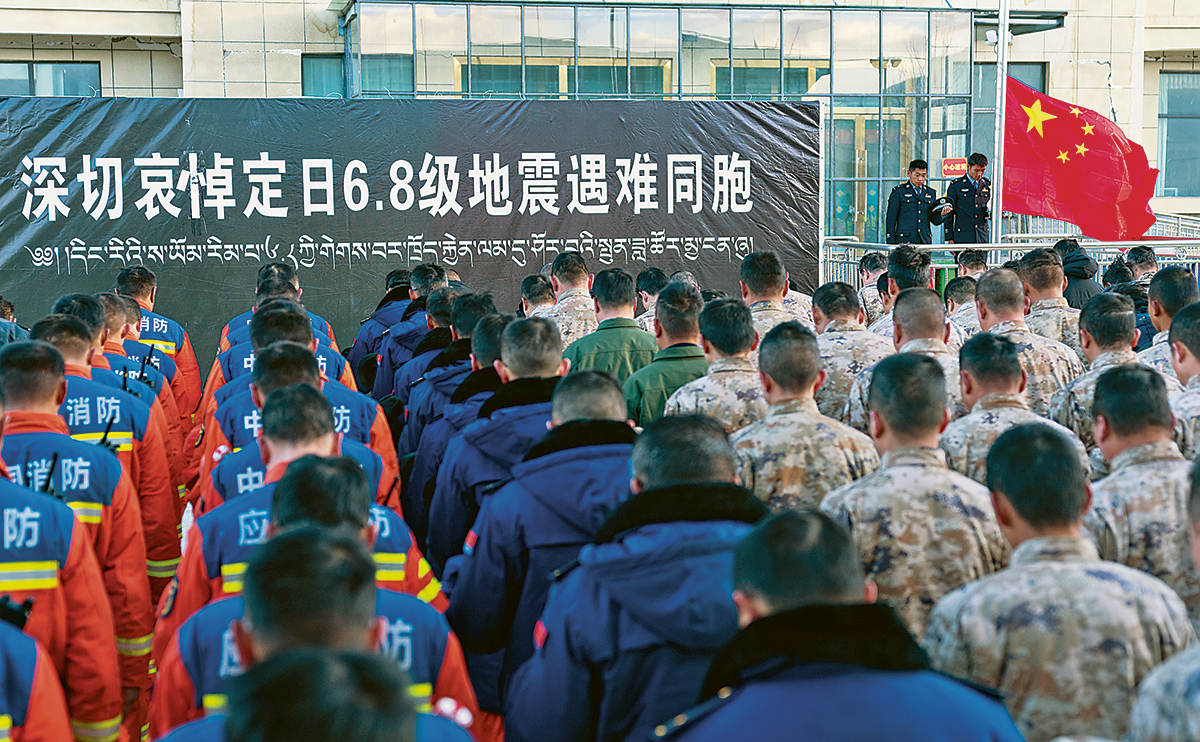 正在定日县曲洛乡嘎白村帮群众转运物资的日喀则军分区某部官兵,在一栋坍塌的房屋前集合列队,举行悼念仪式。带队干部李忠海说:“今天我们哀悼遇难同胞,要化悲伤为力量,全力以赴帮助受灾群众尽快重建家园。”