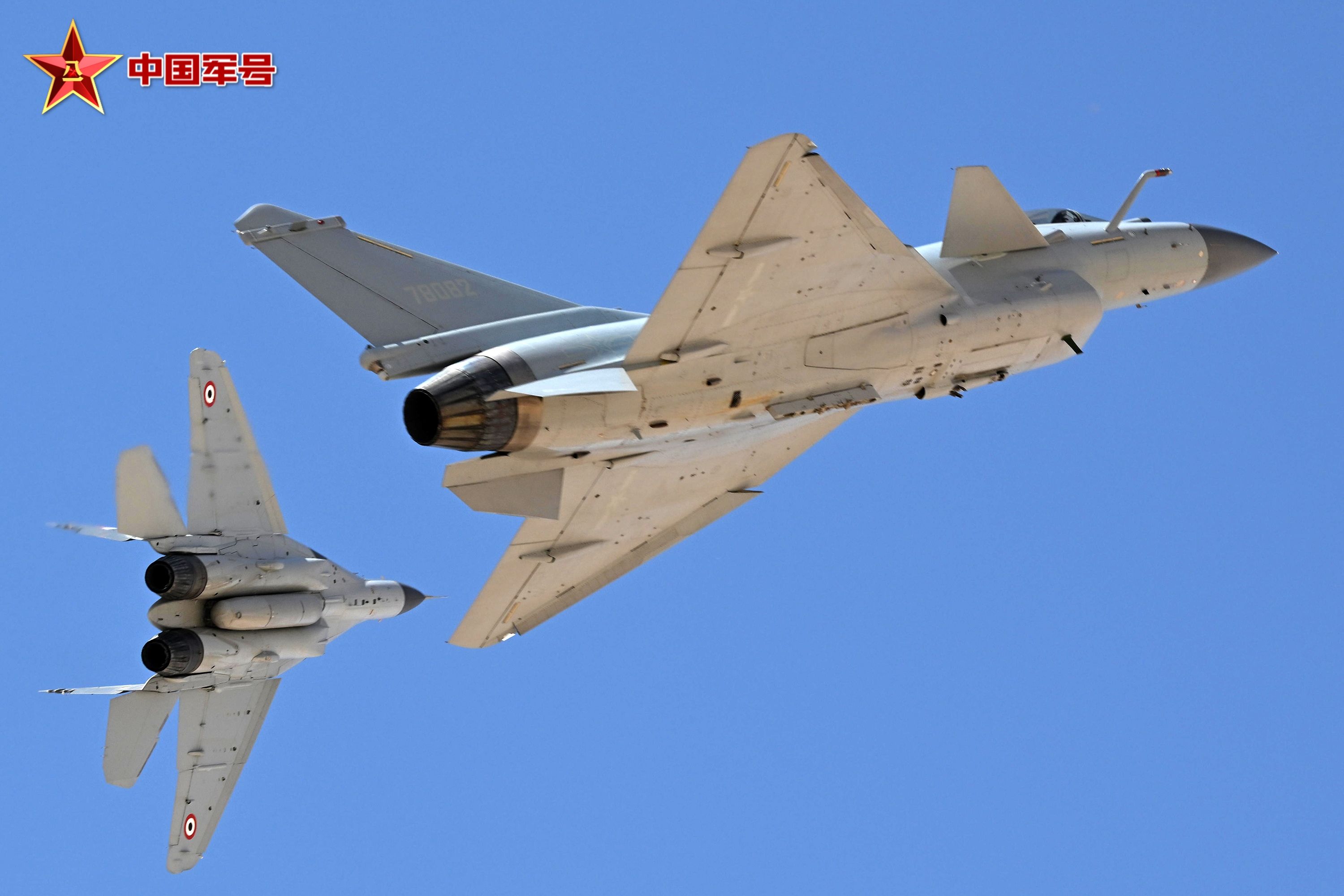 4月19日,埃及空军某基地,参加中埃“文明之鹰-2025”空军联合训练的中国空军歼-10C战机与米格-29战机进行训练。