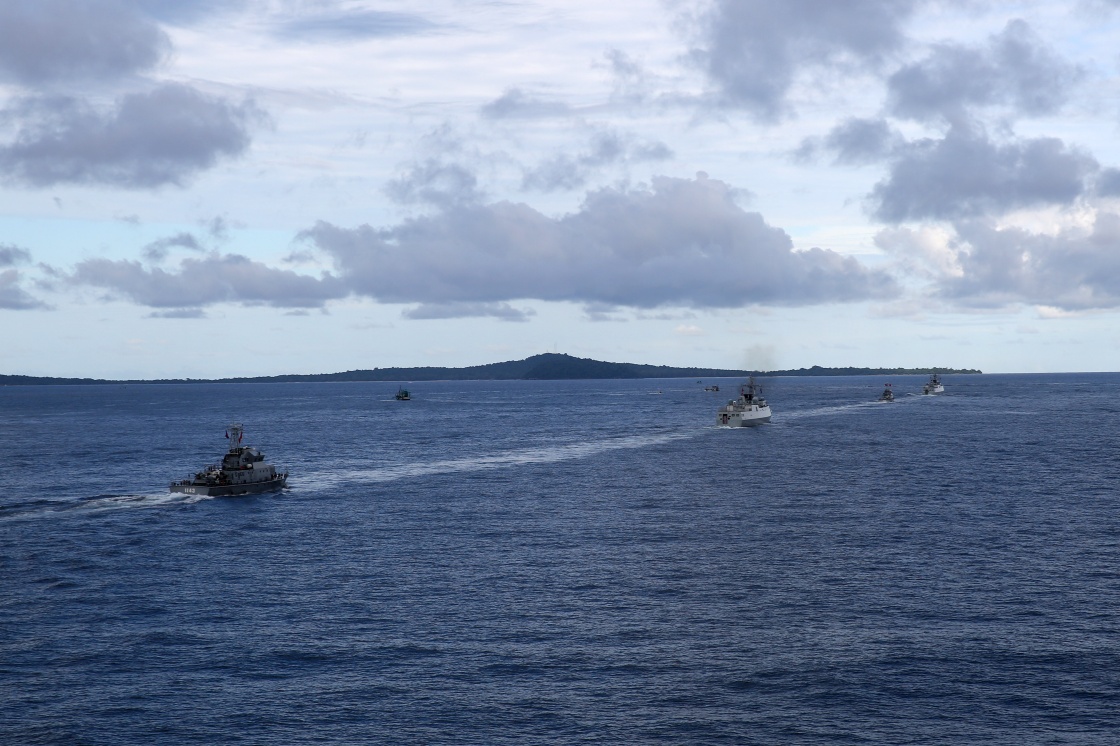 5月26日,中柬“金龙-2025”联演海空方向实兵演练在柬埔寨西哈努克港附近海空域举行,参演的中柬联合任务编队开展海上航渡训练。新华社发(甘俊 摄)