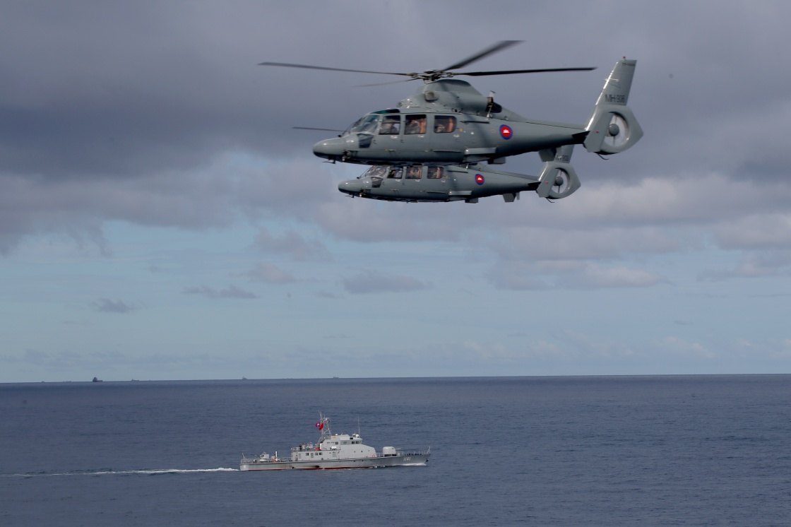 5月26日,中柬“金龙-2025”联演海空方向实兵演练在柬埔寨西哈努克港附近海空域举行,参演直升机发射热诱弹。新华社发(甘俊 摄)