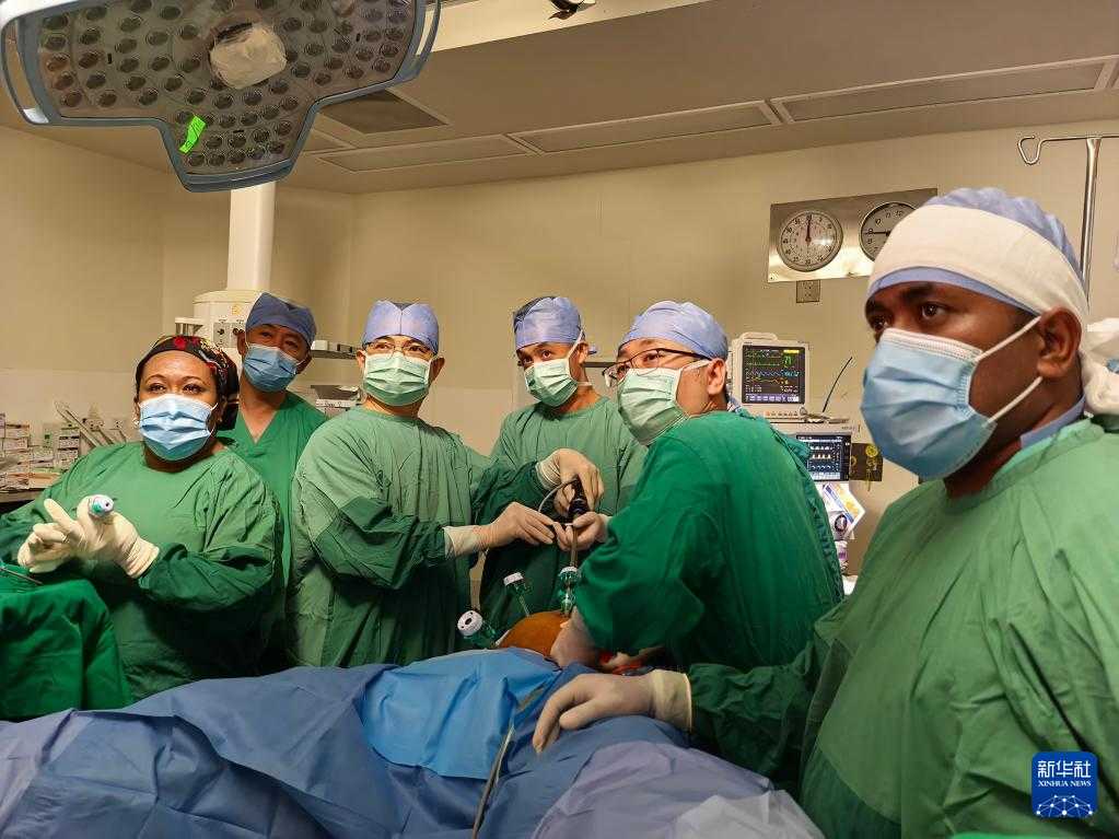 10月6日,在斐济首都苏瓦殖民战争纪念医院,中国海军“丝路方舟”号医院船医生与当地医生为患者进行手术。新华社发(崔晓洋摄)