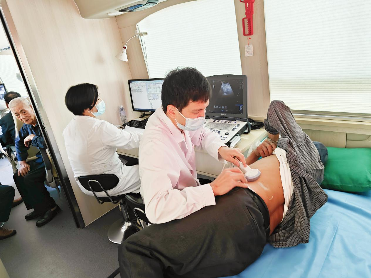↑18日,太姥山镇的优抚对象正在医疗巡诊车上做彩超检查