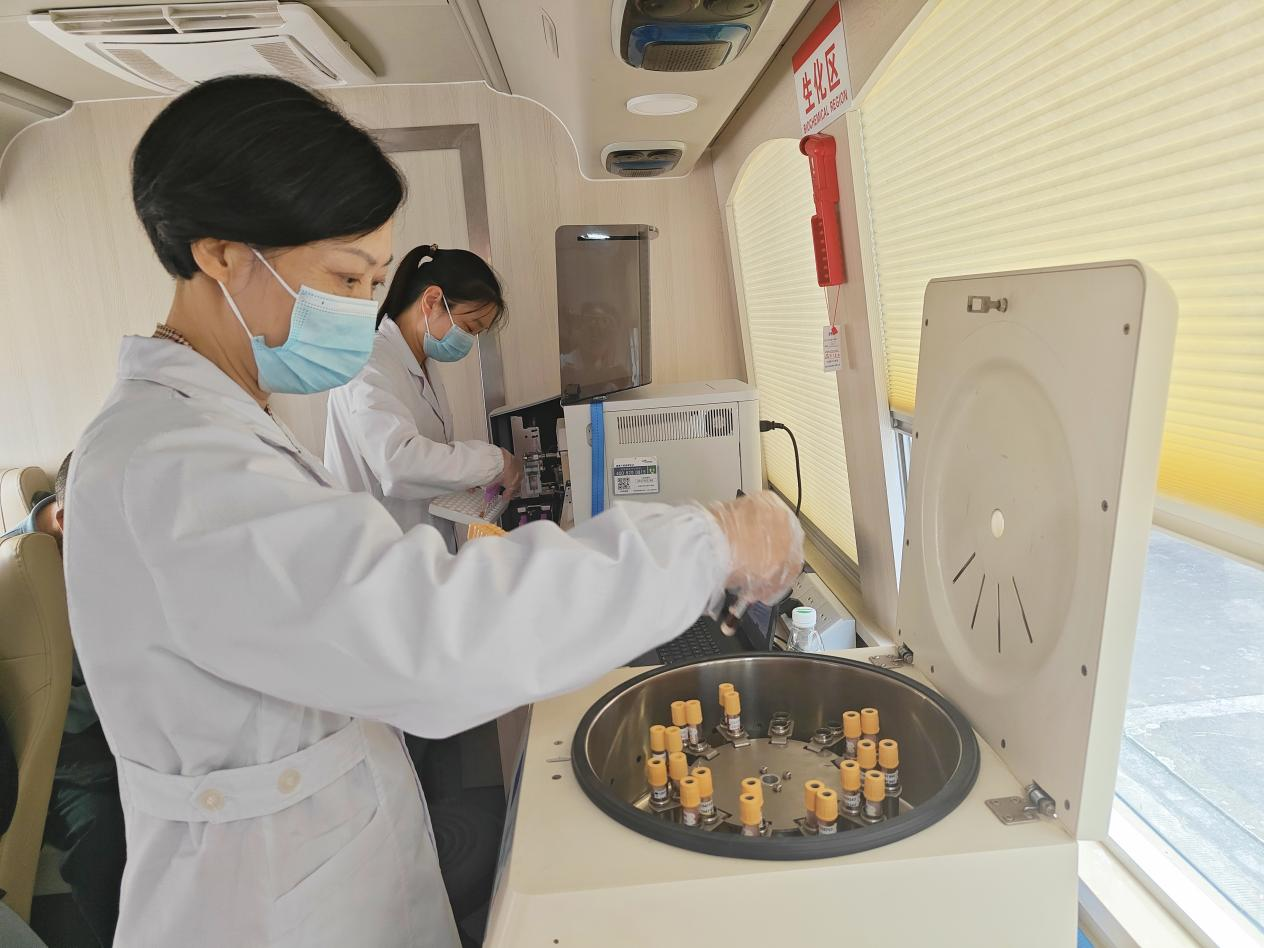 ↑医务人员正在巡诊车上进行血液标本的前期处理
