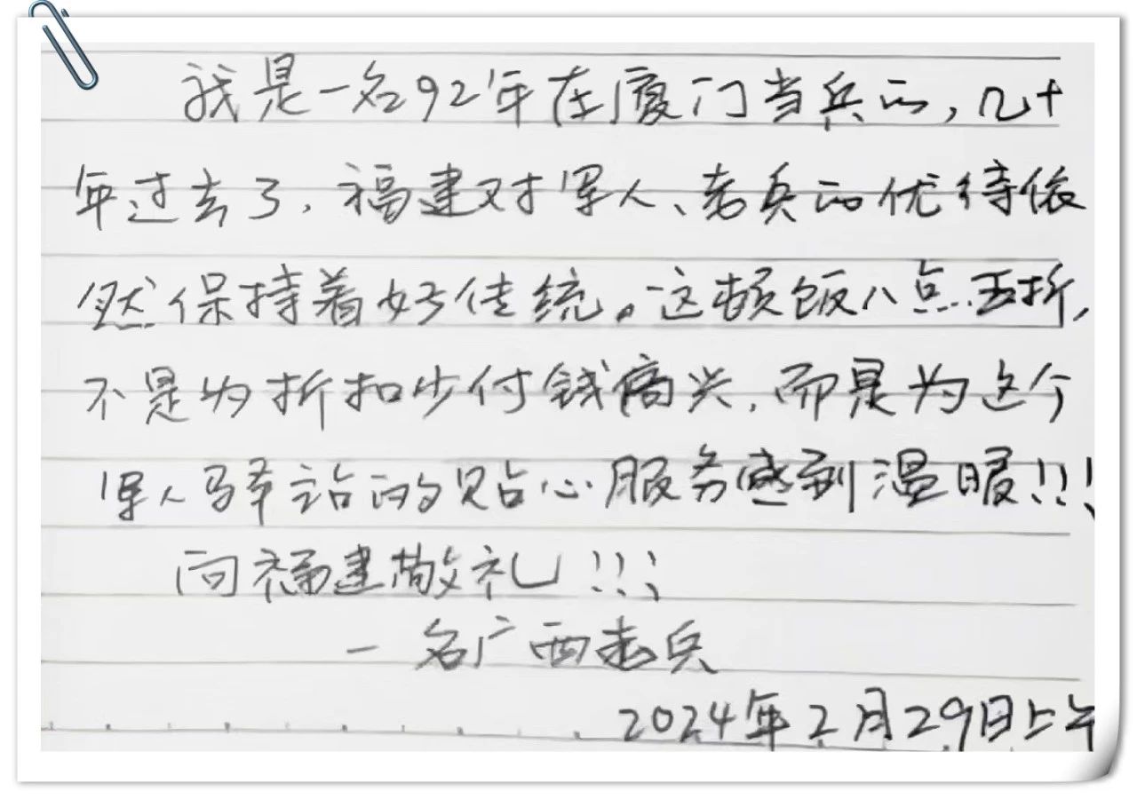 “我是一名1992年在厦门当兵的老兵,福建对军人的优待依然保持着好传统。向福建敬礼!”