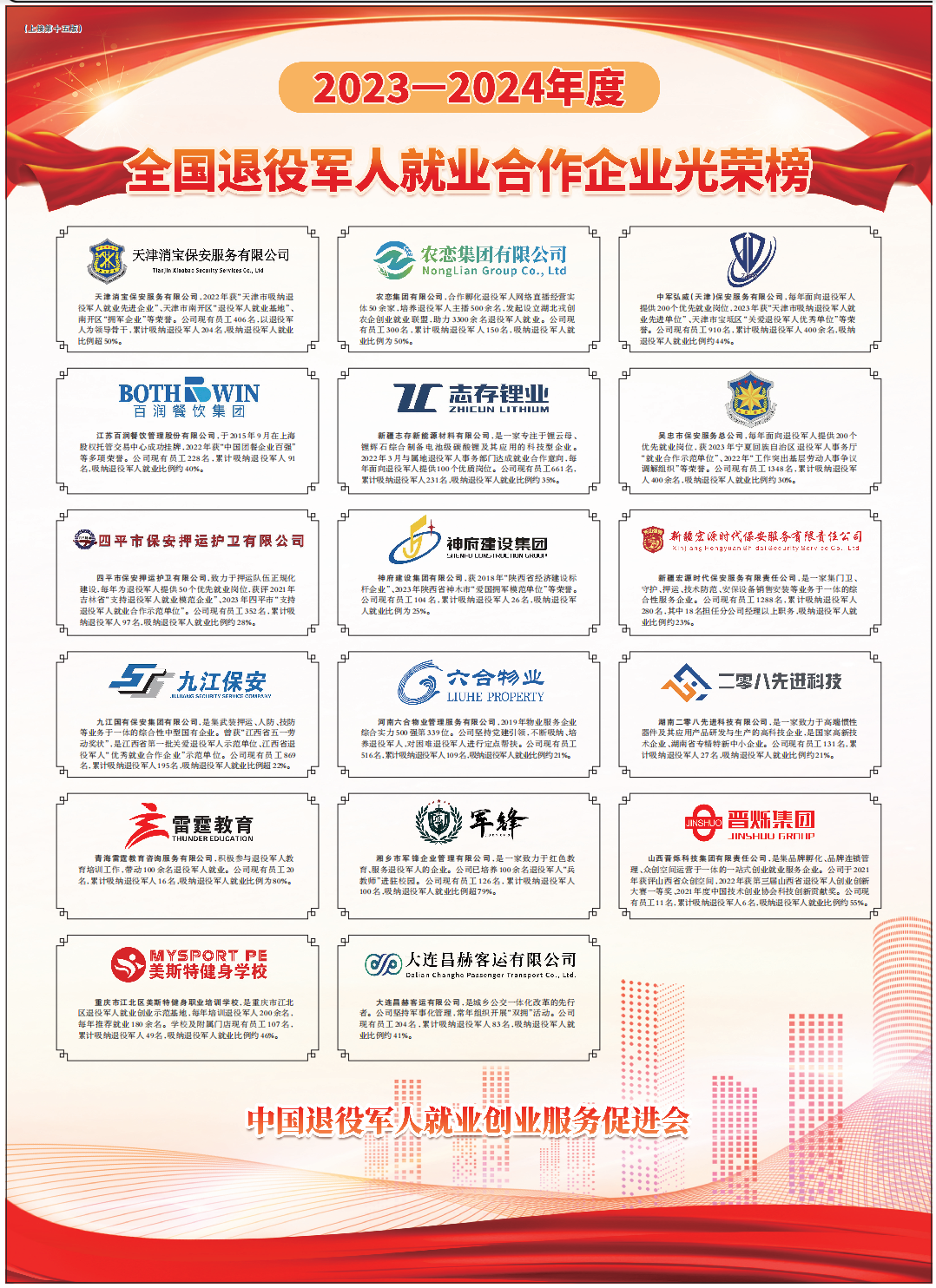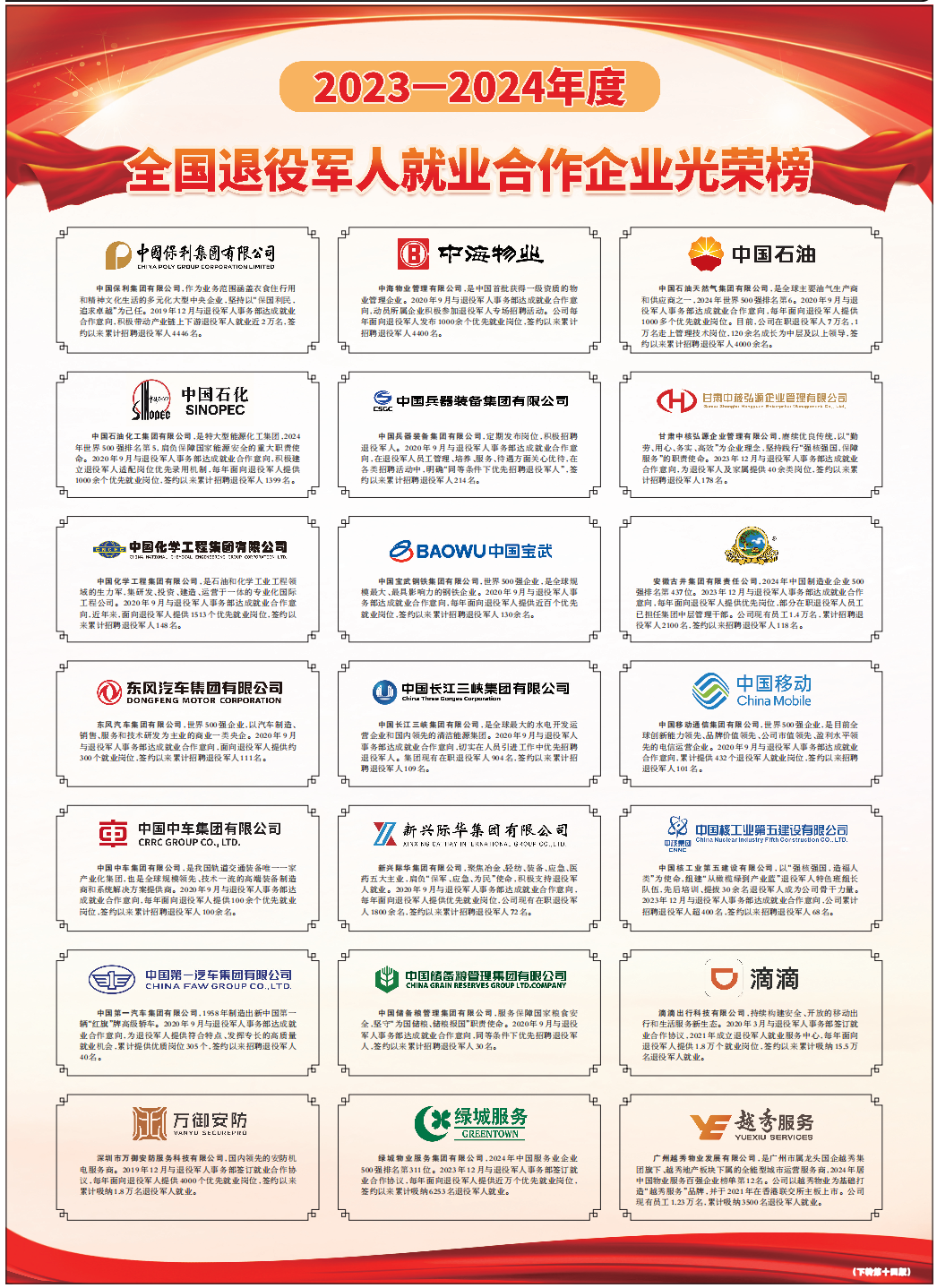 全国退役军人就业合作企业光荣榜
