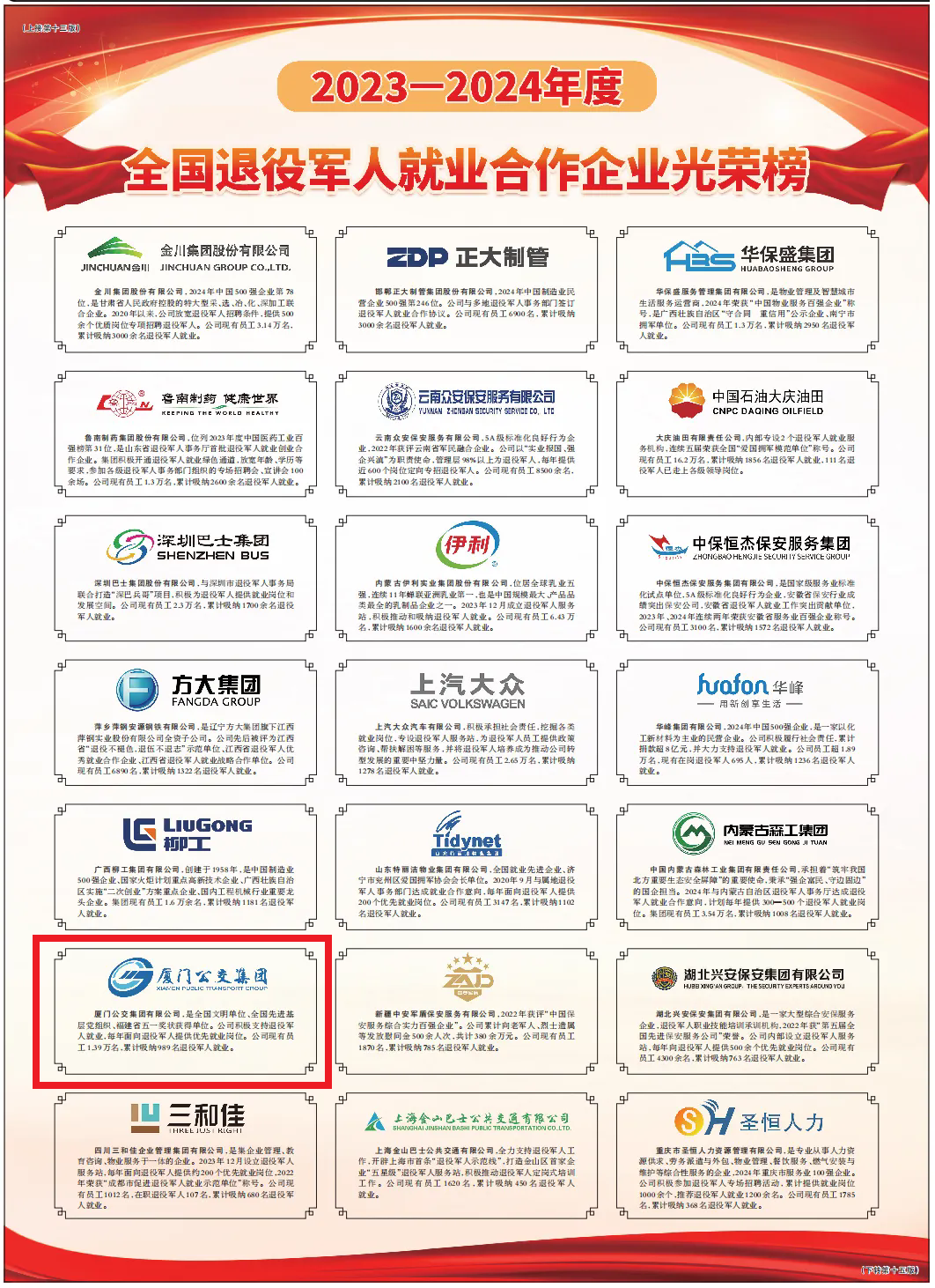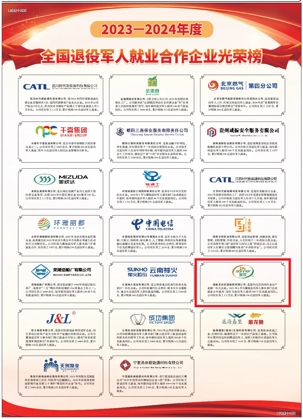 近日,《人民日报》刊登了2023—2024年度“全国退役军人就业合作企业光荣榜”,我省厦门公交集团有限公司、福建圣农控股集团有限公司2家企业光荣上榜。