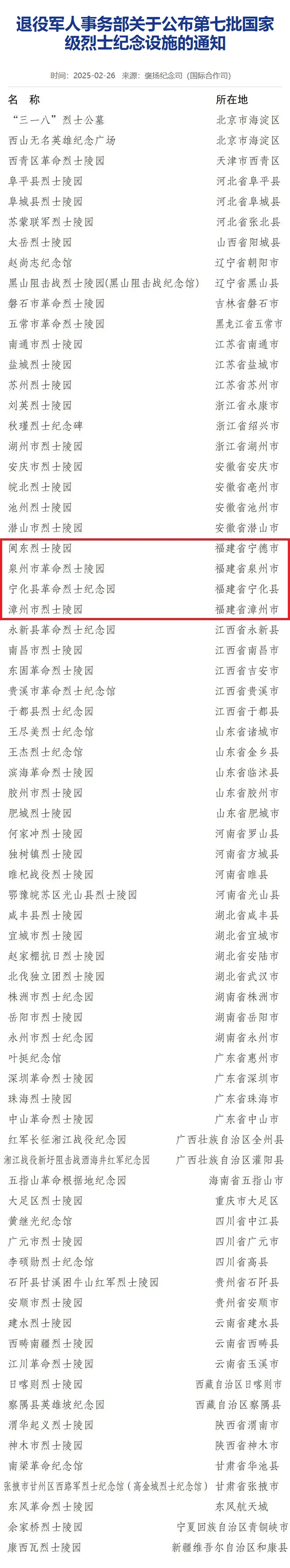 经国务院批准,退役军人事务部2025年2月25日发布《关于公布第七批国家级烈士纪念设施的通知》,公布第七批71处国家级烈士纪念设施名单。我省闽东烈士陵园、泉州市革命烈士陵园、宁化县革命烈士纪念园、漳州市烈士陵园4处省级烈士陵园升级为国家级烈士纪念设施。至此,我省国家级烈士纪念设施已达12处,实现各设区市都有国家级烈士纪念设施的目标,这是我省各级大力推动烈士褒扬工作高质量发展的又一实践成果。