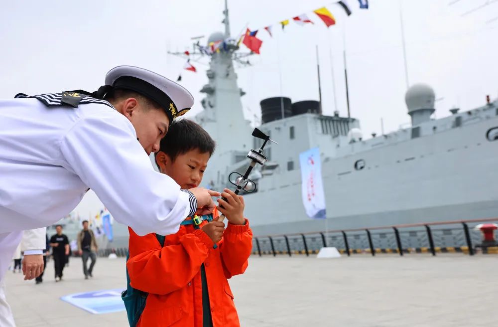 4月22日,一个小朋友在海军战士指导下体验使用三杯风向风速仪。新华社记者方喆摄