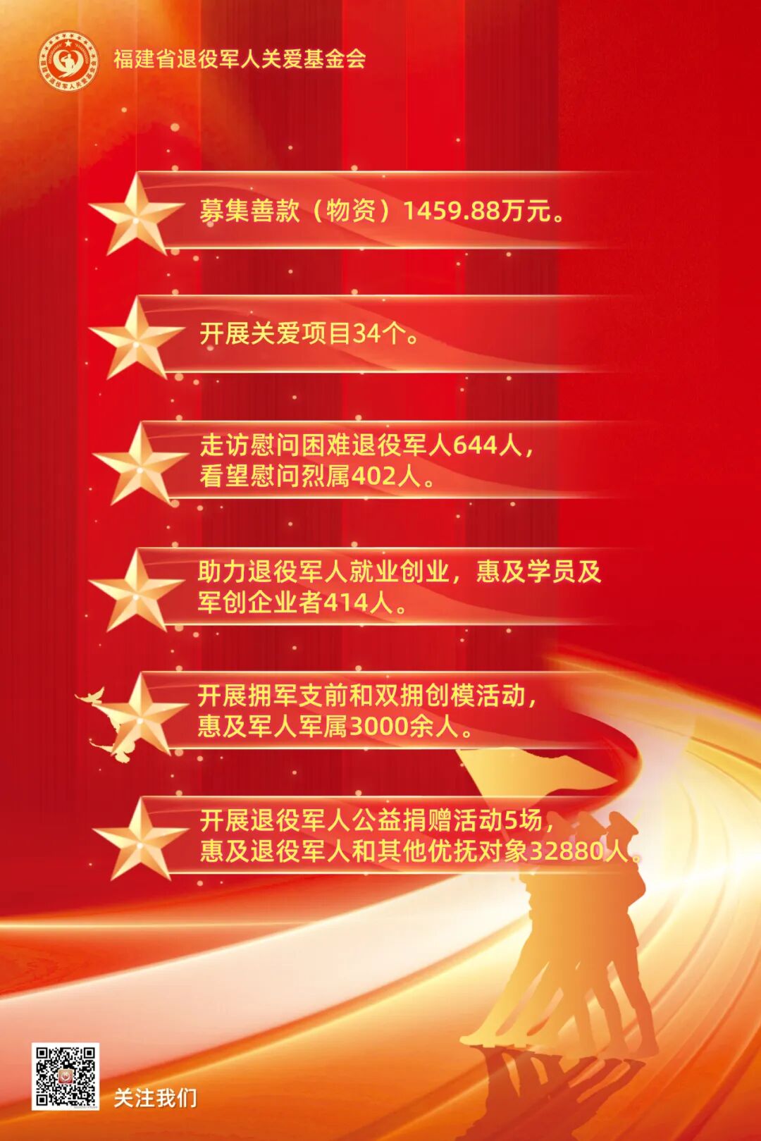 爱始于心,善始于行。2023年9月20日,在省退役军人事务厅党组精心指导下,福建省退役军人关爱基金会正式成立,2年来,基金会始终不忘初心使命,凝聚爱心力量,传递党和政府的关怀,传送企业和社会组织的爱心,让退役军人和其他优抚对象获得感、荣誉感、幸福感成色更足,有力有效推动我省退役军人服务保障工作高质量发展。