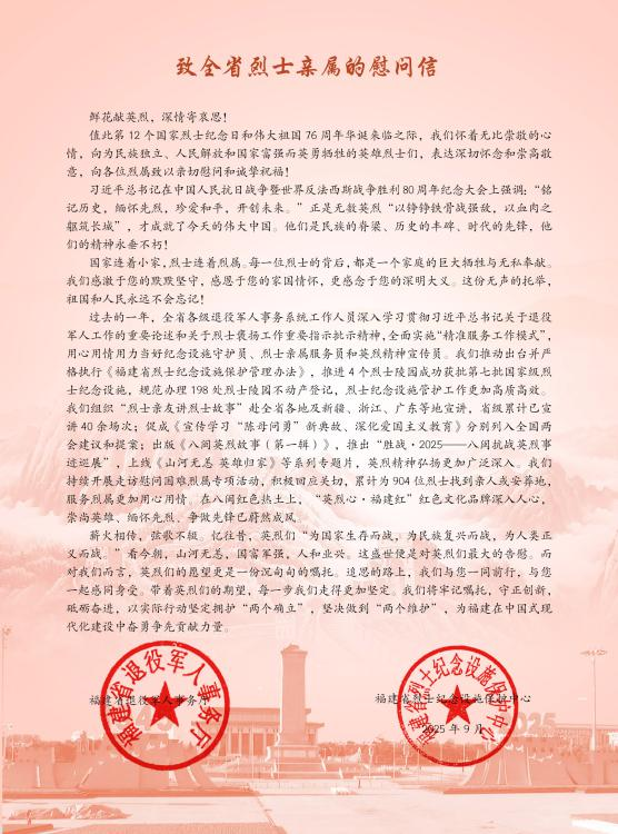 近日,一封饱含尊崇与深情的慰问信,以特快专递或者志愿者上门送达的形式,送到全省烈士亲属的手中。这是省退役军人事务厅在今年“9.30”烈士纪念日和新中国76周年华诞来临之际,连续第3年向全省烈士亲属送上慰问信。