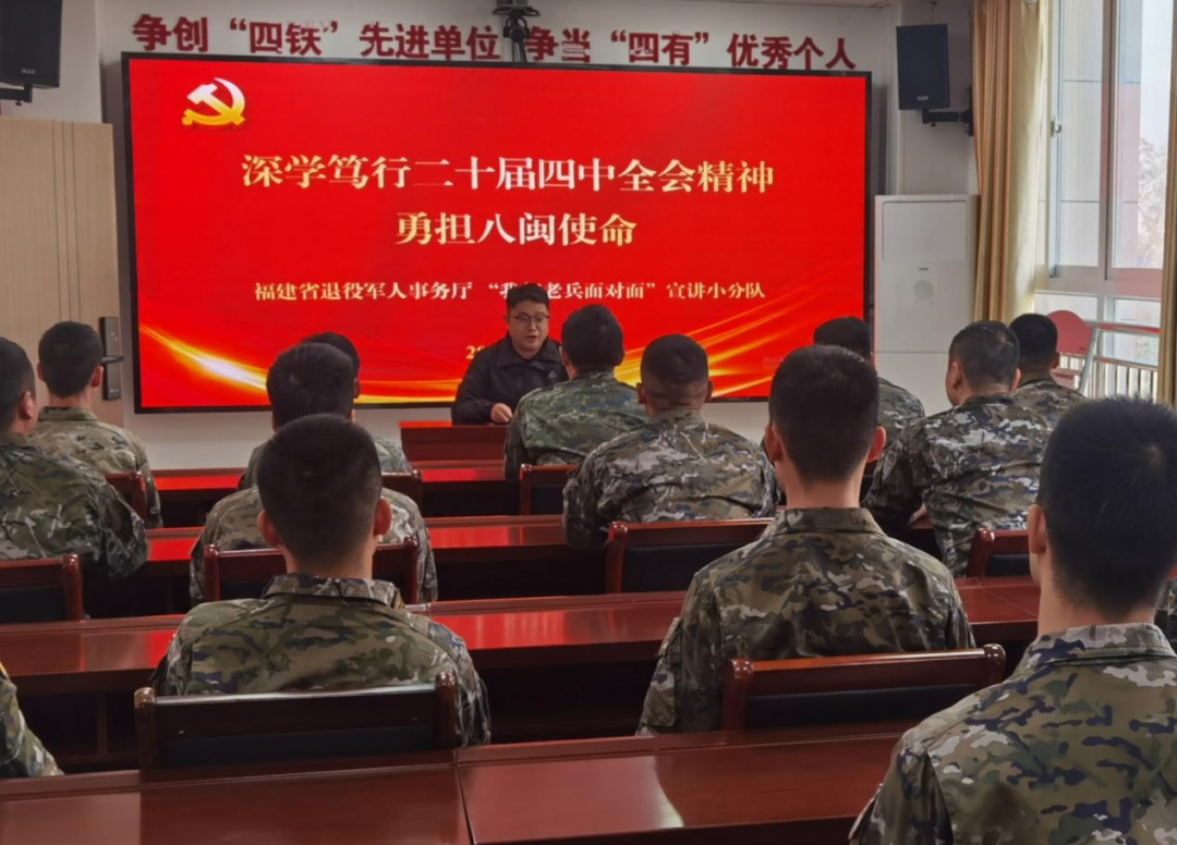 在海警驻泉州某部,小分队围绕党的二十届四中全会精神,介绍“十四五”期间国防和军队建设发展成就与我省双拥工作成效,展望“十五五”时期国防和军队现代化发展蓝图,并“面对面”解读抚恤优待、退役安置等政策,受到官兵好评。