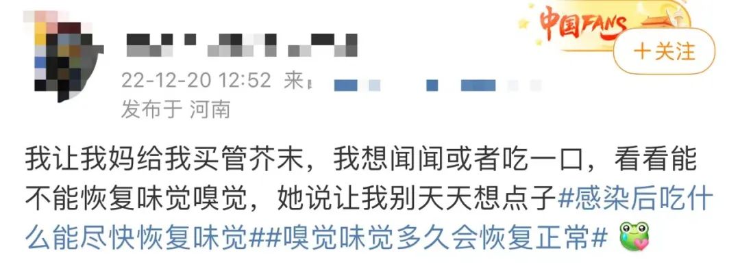 “发烧、浑身酸痛的症状消失后,还是闻不到味道,喝醋都感觉没有酸味,我这是咋了?”近期多位网友在社交媒体平台上反映,感染康复后出现味觉、嗅觉减退的症状,有人2-3天自动恢复了,但有人已经持续了近一周。专家表示,这并非是新冠后遗症,综合国外各项研究显示,大多数在一个月以内都会恢复。