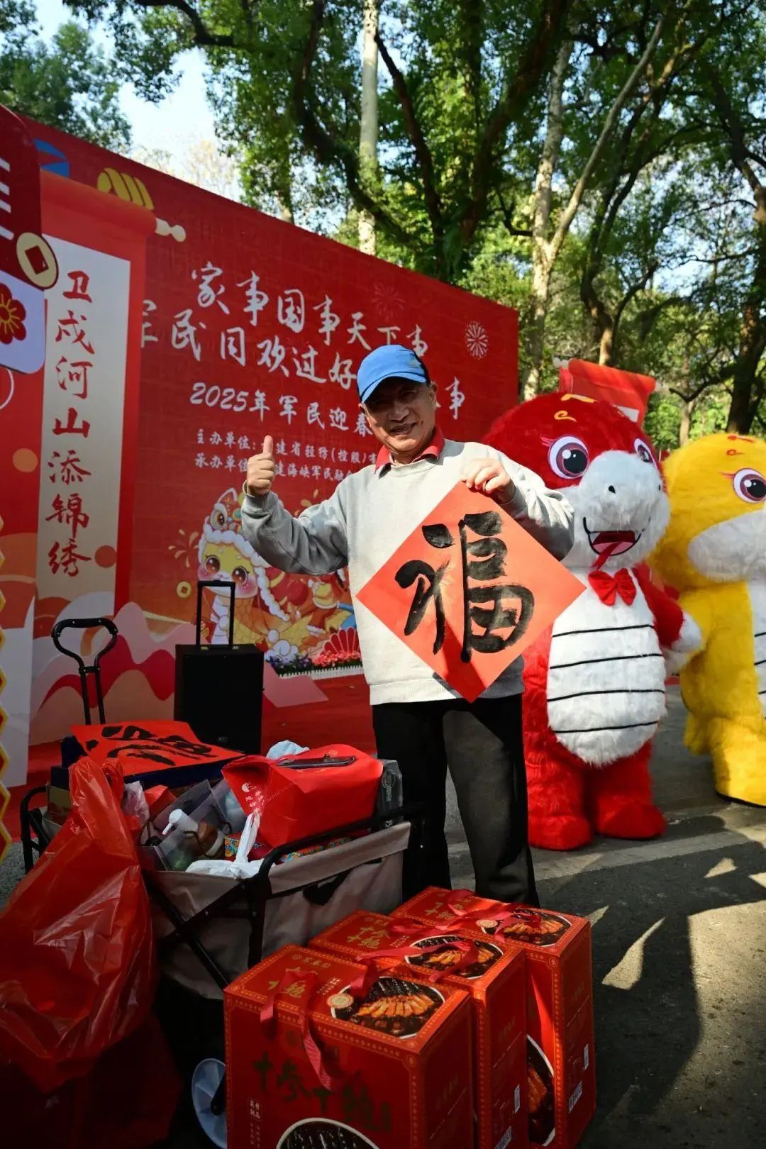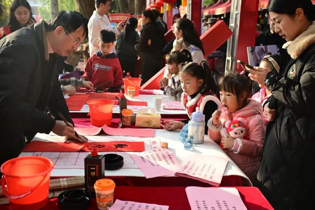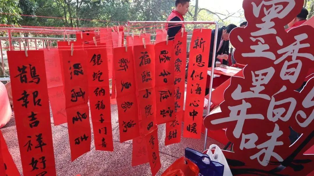 年货节的一角,公司特邀而来的书法家们正挥毫泼墨,写下一个个苍劲有力的“福”字和一幅幅对仗工整的春联,字里行间浸润着浓浓的军民鱼水情,饱含着海峡融合对人民子弟兵的美好祝福。