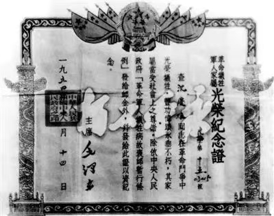 沈尔七(沈庆炬)革命牺牲军人家属光荣纪念证