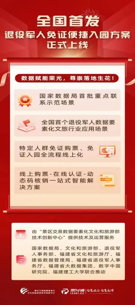 这项服务是由文化和旅游部、国家数据局联合指导,退役军人事务部退役军人信息中心大力支持,福建省退役军人事务厅联合福建省文化和旅游厅、福建省数据管理局、福建省大数据集团、景区交易数据要素化文化和旅游部技术创新中心等单位共同推动实施,核心是依托福建成熟的“数字身份+数据共享”体系,打破传统“实体证核验”局限,全国退役军人无需出示任何身份证明材料,即可在全国接入“景旅纵横”微信小程序的景区畅享“免证购票、免证入园”便捷服务体验。