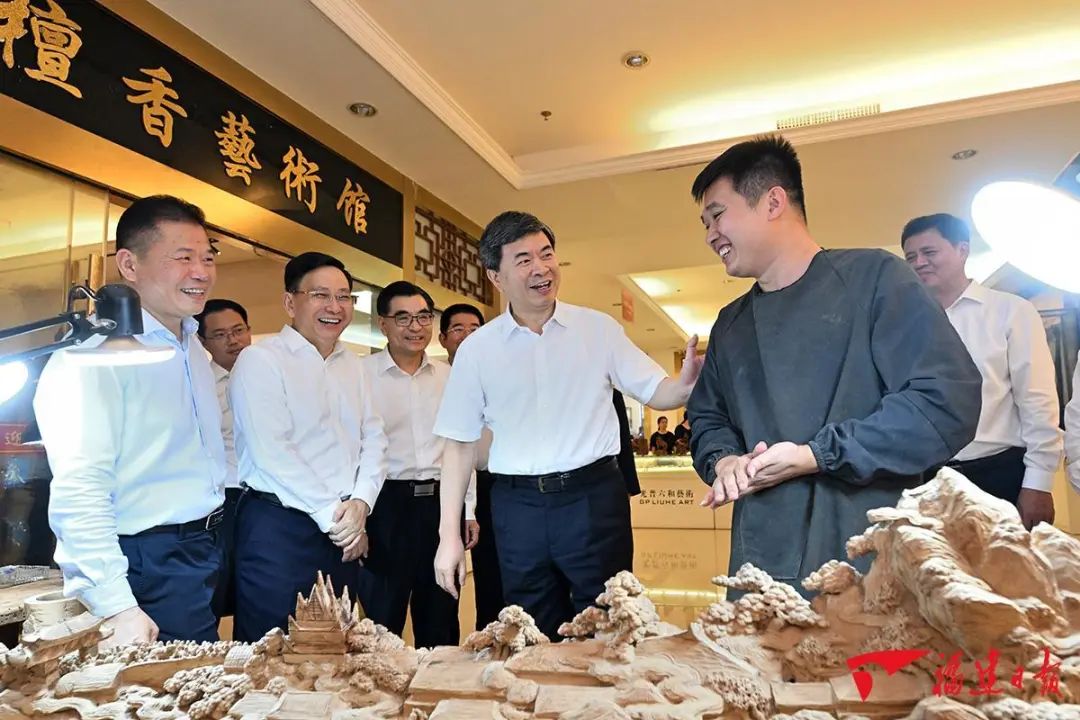 以木为纸、刀为笔,仙游县是知名“仙作”古典家具发源地。如何推动传统特色工艺美术产业转型升级、创新发展?周祖翼来到三福集团,询问古典家具产业发展现状和企业近年来销售经营、创新开发、人才培养等情况,与正在精雕细琢的雕刻师交流,饶有兴致地了解“仙作”技艺特点,并叮嘱他们在埋头创作的同时要注意保重身体。周祖翼希望企业要坚守主业,做大做强品牌,不断开拓新领域、新市场;要大力推广非遗技艺文化,把这门手艺一代一代传承下去、发扬光大。得益于丰富的工艺美术产业资源,仙游抖音电商直播基地蓬勃发展,今年前三季度商家网络销售额达48亿元,在全国同类基地名列前茅。周祖翼走进基地数字展厅,听取了解电商行业运营情况,希望当地着力发展直播电商等新业态,加快产业数字化转型,为实体经济插上数字翅膀,让古典家具工艺焕发新生。莆田木雕兴于唐宋、盛于明清,崛起于当代。在春晖木雕艺术馆,周祖翼与非遗传承人深入交流,强调要注重非物质文化遗产的保护传承,加大对传统技艺的弘扬创新,加强文化遗产保护人才的培养,为推动中华优秀传统文化创造性转化、创新性发展作出福建贡献。周祖翼还调研了仙游千亿级新能源新材料产业园建设现场。