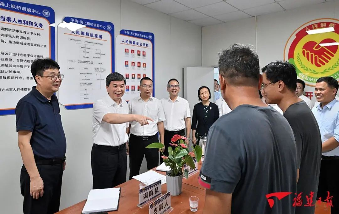 社会治理,重在基层。位于秀屿区平海一级渔港内的平海镇海上枫桥调解中心,创新矛盾纠纷化解机制,知民情、排民忧、解民难,用心用情用力,推动实现“矛盾不上交、平安不出事、服务不缺位”。夕阳金晖中,渔船停泊有序,渔村宁静安逸。周祖翼察看了渔船管理和渔港作业环境,走进调解中心的来访登记室、人民调解室、“三官一律”工作室等,向正在进行调解的群众询问纠纷产生原因,叮嘱一定要深入摸清群众诉求、妥善处理化解,并观看了大数据调度指挥平台。周祖翼强调,发动群众、依靠群众是“枫桥经验”的关键所在。要扎实深入开展第二批主题教育,贯彻落实习近平总书记关于坚持好、发展好新时代“枫桥经验”的重要指示精神,传承弘扬“四下基层”“四个万家”优良作风,从群众中来、到群众中去,切实把问题解决在基层、化解在萌芽状态,走好新时代党的群众路线。要持续强化基层社会综合治理,充分发挥基层党组织战斗堡垒和党员先锋模范作用,层层压实责任、明确职责,通过定期走访等多种方式主动发现问题矛盾,及时疏导化解。要在乡村振兴建设中突出平安和谐,从源头上减少矛盾纠纷产生,进一步加强法治教育,完善村规民约,打造文明乡风,改善公共活动空间,拓宽交流沟通渠道,引导村民自省自律、敦亲睦邻,形成尊法崇德向善的社会氛围。
