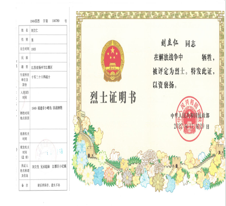 “刘力仁烈士,中国人民解放军步兵第十兵团28军245团三营,江苏省江都县小其区王屋晋人,1949年10月8日牺牲。”在去年开展的2022年“为英烈寻亲”专项行动中,泉州市退役军人事务局上报一条关于江苏籍英烈刘力仁的寻亲信息。志愿者沈巧云团队主动与泉州市退役军人事务局取得联系,表示江苏英名录中记载:刘立仁,十军二十八师战士,江苏省扬州市江都区小纪镇人。由于年代久远,烈士墓碑记载的信息与江苏省英名录信息存在些许出入。经查阅江都区档案馆材料与当地退役军人事务局工作人员、志愿者实地走访调查,最终确认“刘力仁”与“刘立仁”为同一人。