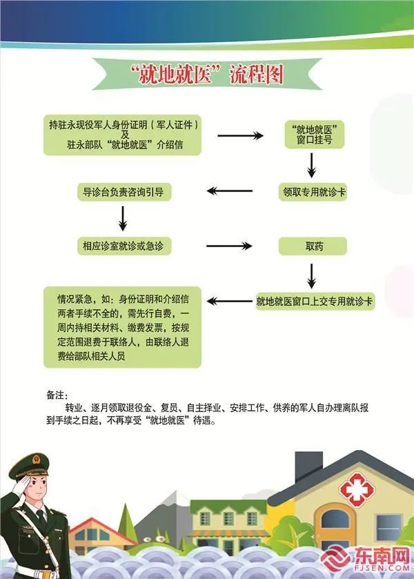为着力解决驻地官兵日常就医的难点、痛点问题,永安市率先出台了《永安市驻军“就地就医”实施办法(试行)》。凡是持驻永现役军人身份证明(军人证件)及永安市“就地就医”介绍信的官兵,只要前往永安总医院“就地就医”窗口挂号,领取专用就诊卡后,即可在门诊、急诊享受到军人“绿色通道、优先就诊、免费就诊”等优质医疗服务。