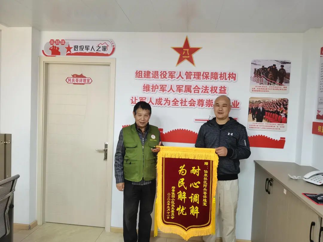 仙泉社区阿兵哥评理室收到某小区业主委员会锦旗
