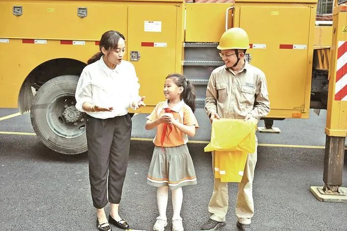 郭凌(左)和同事给学生普及电力知识