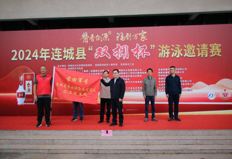 近日,在龙岩市连城县举办“双拥杯”游泳邀请赛之际,连城县冬泳协会正式成立了首支“古田军号”退役军人水上救生队。图片