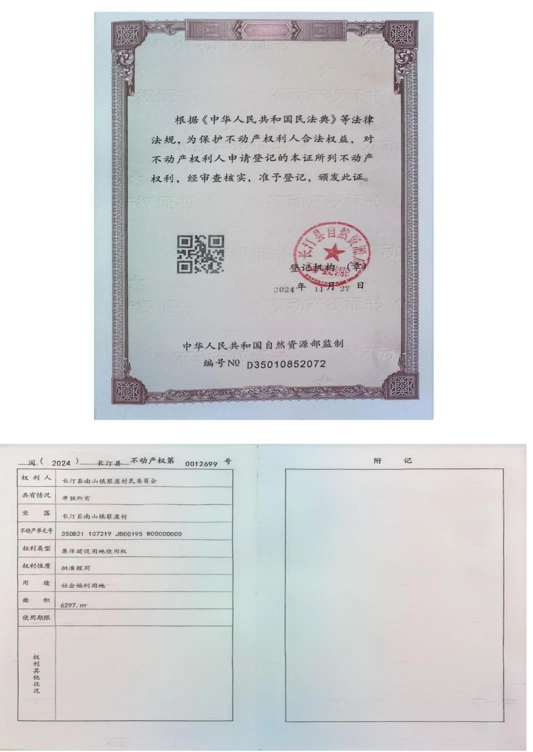 为顺利推进这一工作,长汀县退役军人事务局多方协调,积极开展不动产测绘,形成地籍调查成果资料和确权资料。长汀县自然资源局、不动产登记中心等部门全力高效配合,相关领导及业务人员多次召开专题会研究,针对建设时间早、材料不全等历史原因导致的办证难的问题,精准施策、特事特办,简化流程。在各部门齐心协力下,11月27日,蔡屋村法人从不动产登记中心工作人员手中接过了这本证。