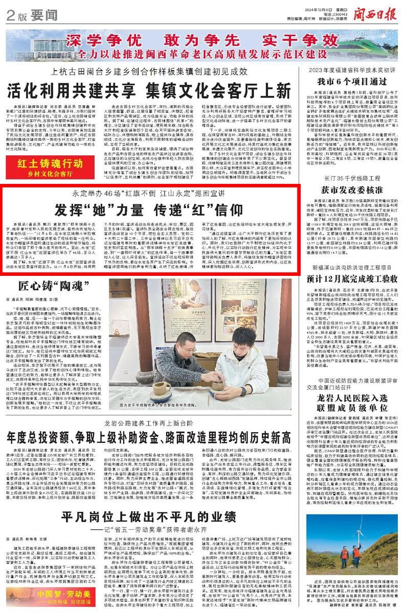 “那年锦辉十五岁,她带着对党和人民的无限忠诚,毅然决然地加入了革命队伍......”12月6日,在龙岩市永定区城南小学阶梯教室内,一场深情的宣讲感染了现场的每一位听众。永定巾帼宣讲员蓝昕通过生动的叙述和细节描绘,将听众们带回了那个烽火连天的年代。至此,永定“红旗不倒江山永定”巡回宣讲活动已举办了46场,受众人数高达1万多人。
