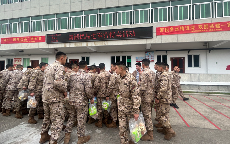 2月21日,由泉州市双拥共建办指导,洛江区双拥共建办、洛江区商务局主办的“国货潮品”进军营特卖活动走进驻洛某部队。泉州宏恩食品有限公司、福建渔享食品有限公司、福建省泉珍思饼有限公司等企业到场参与。