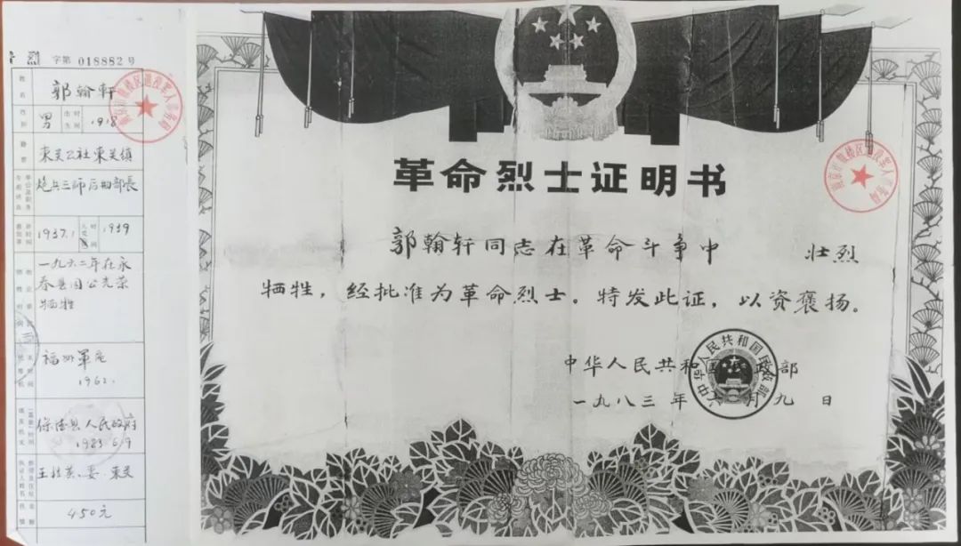 郭翰轩烈士,原籍山西省保德县东关镇,1937年参军入伍,生前担任某师后勤部长,1962年牺牲。2024年5月,其子郭满平通过南京市鼓楼区退役军人事务局,致函永春县退役军人事务局,请求协助寻找烈士安葬地。