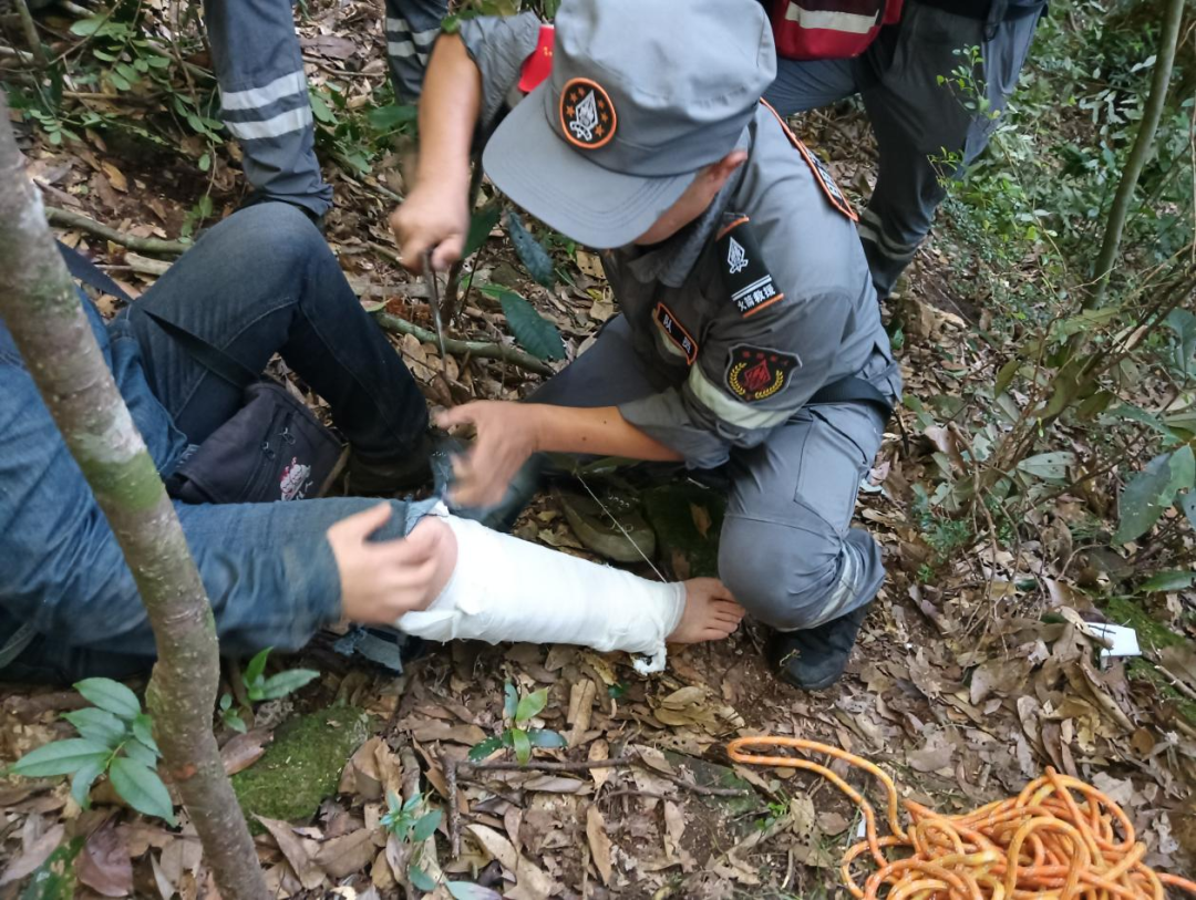 经队员初步检查,伤者腿部存在明显肿胀、畸形,疑似发生骨折,且伤口处有轻微渗血。救援人员立即按照专业急救流程展开处置:一名队员蹲在伤者身旁,轻声安抚其情绪,分散其注意力;另一名队员小心翼翼地用生理盐水为伤者伤口进行清洗消毒,避免感染;随后,两人默契配合,将医用夹板精准贴合在伤者骨折腿部两侧,用绷带进行均匀缠绕固定,确保松紧度适宜,既能起到支撑保护作用,又不会影响血液循环;最后,用无菌纱布对伤口进行妥善包裹,最大限度避免后续移动过程中造成二次伤害。