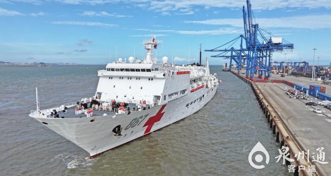 8月28日下午4时许,海军“丝路方舟”号医院船停靠泉州港。在接下来的几天时间里,“丝路方舟”号医院船将与共建城市泉州开启“城舰永相依共续海丝情”一系列共建活动。(陈小阳摄)