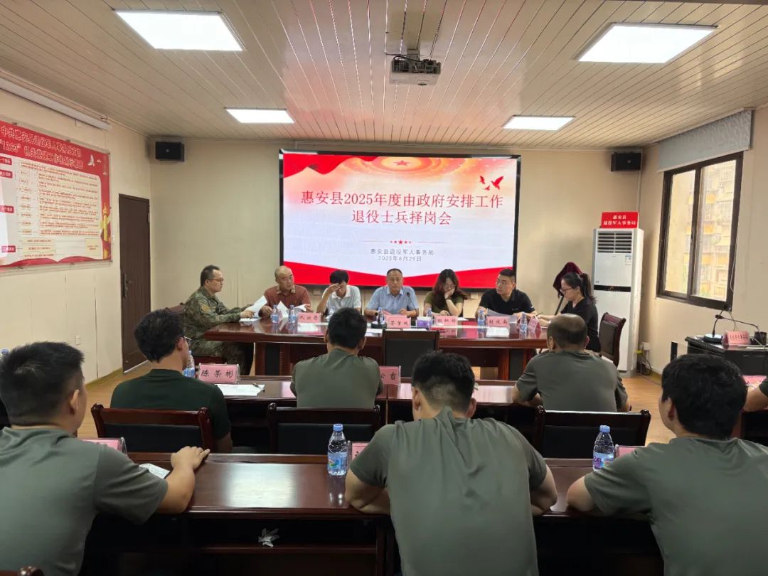 为扎实做好转业军士安置工作,确保安置过程公开、公平、公正,8月29日,惠安县召开2025年度转业军士选岗安置会。会上,相关负责人向转业军士们系统解读了安置政策、详细介绍各用人单位的岗位信息,并清晰演示选岗流程,确保每一位转业军士都能充分了解政策、熟悉岗位、掌握规则,为做出理性选择奠定了坚实基础。