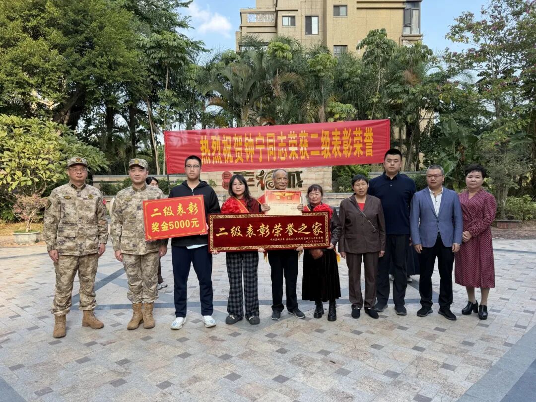 12月8日,莆田市荔城区人武部、荔城区退役军人事务局、西天尾镇等组成拥军优属慰问小组,为在部队荣立二级表彰的现役军人钟宁家庭送上立功喜报和功勋匾,传达党和政府对军人军属的问候与祝福。