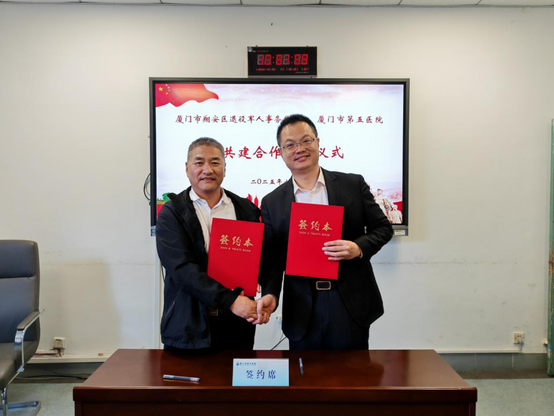 签约仪式在厦门市第五医院举行。翔安区退役军人事务局、翔安区卫生健康局、厦门市第五医院等领导及相关业务负责人共同出席。双方代表正式签署共建合作协议书。
