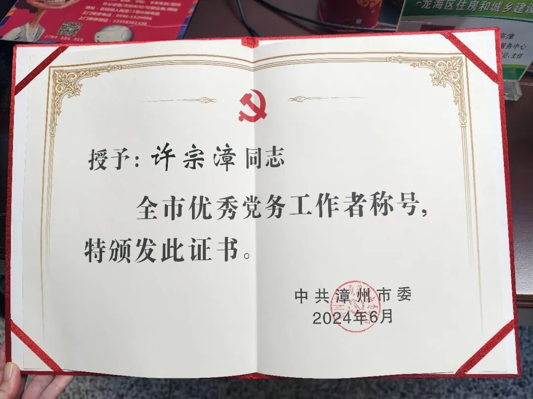 同时,身为市政中心党支部书记,许宗漳在抓实抓细市政业务工作的同时,始终将党建工作摆在突出位置,用心打造特色党建品牌,以党建引领市政业务高质量发展。凭借在党务工作中的出色表现,2024年7月,他被漳州市委评为“全市优秀党务工作者”。
