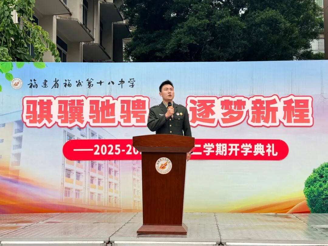 2月26日,福建省福州第十八中学以“骐骥驰骋逐梦新程”为主题,举行2025-2026学年第二学期开学典礼。福州市退役军人事务局革命英烈纪念园讲解员陈喆源以“两种人生,一种信仰”为题,生动讲述了福州籍英烈吴石将军的事迹,展现了“英雄福州城,血性福州人”形象,为全体师生上了一堂深刻的“开学第一课”。
