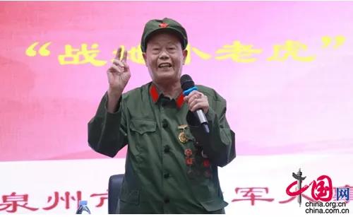 战斗英雄、老党员洪建财的登场将整场故事会推向高潮。洪建财因在某战役中表现卓越,被时任海军司令肖劲光称为“战地小老虎”。今年81岁高龄的他精神矍铄,身穿带满军功章的绿军装,向大家生动讲述不平凡的战斗经历。